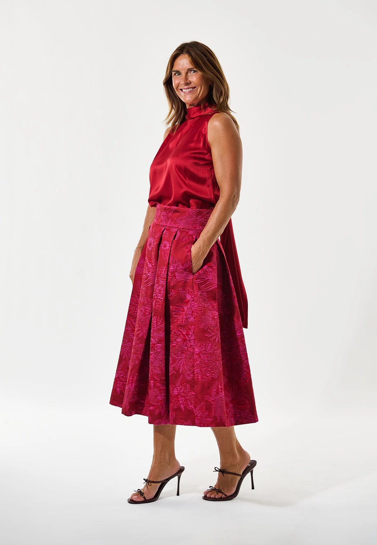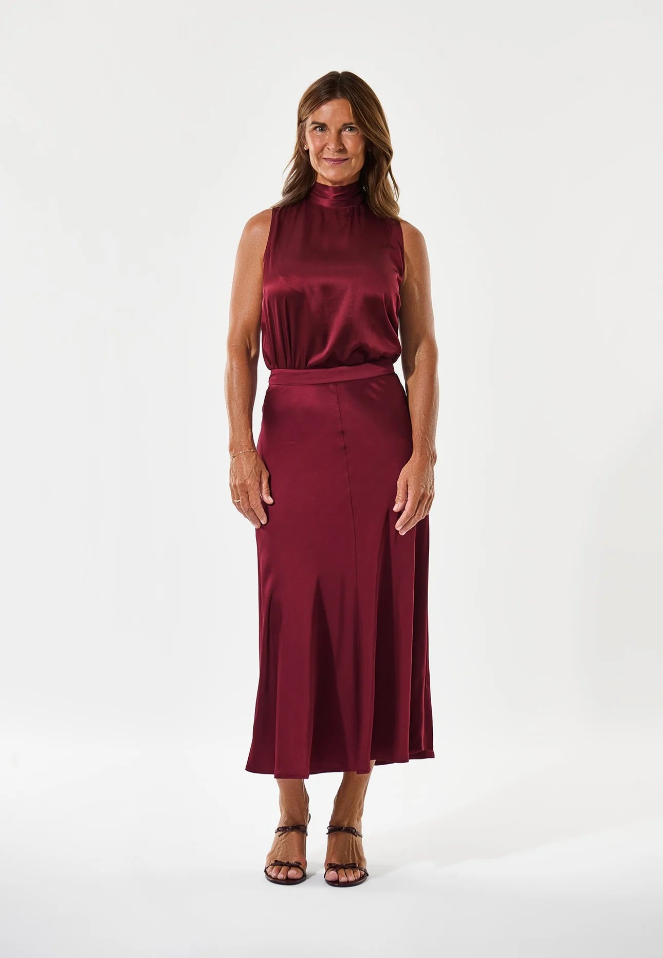 Denne ærmeløse top i dyb bordeaux silketwill er elegant og raffineret og har en høj hals, der kan fastgøres som en løs sløjfe bagpå eller vikles rundt til fronten for flere stylingmuligheder. Toppen har en tætsiddelse pasform.