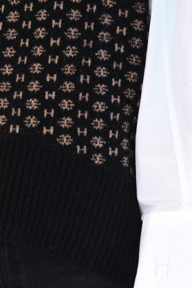 Logo Vest har en høj krave, forlænget ryg og et smukt, detaljeret strikket H-logo. Den er lavet i en blød blanding af kid mohair, merinould og nylon, som giver både varme og lethed. Et stilfuldt og eksklusivt lag, der tilfører struktur og karakter til ethvert outfit.