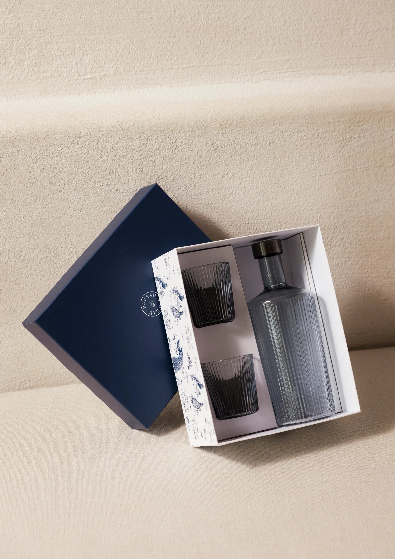 Vi præsenterer vores elegante Bondi-gavesæt: en raffineret flaske og to smarte glas, smukt pakket i en elegant gaveæske.
