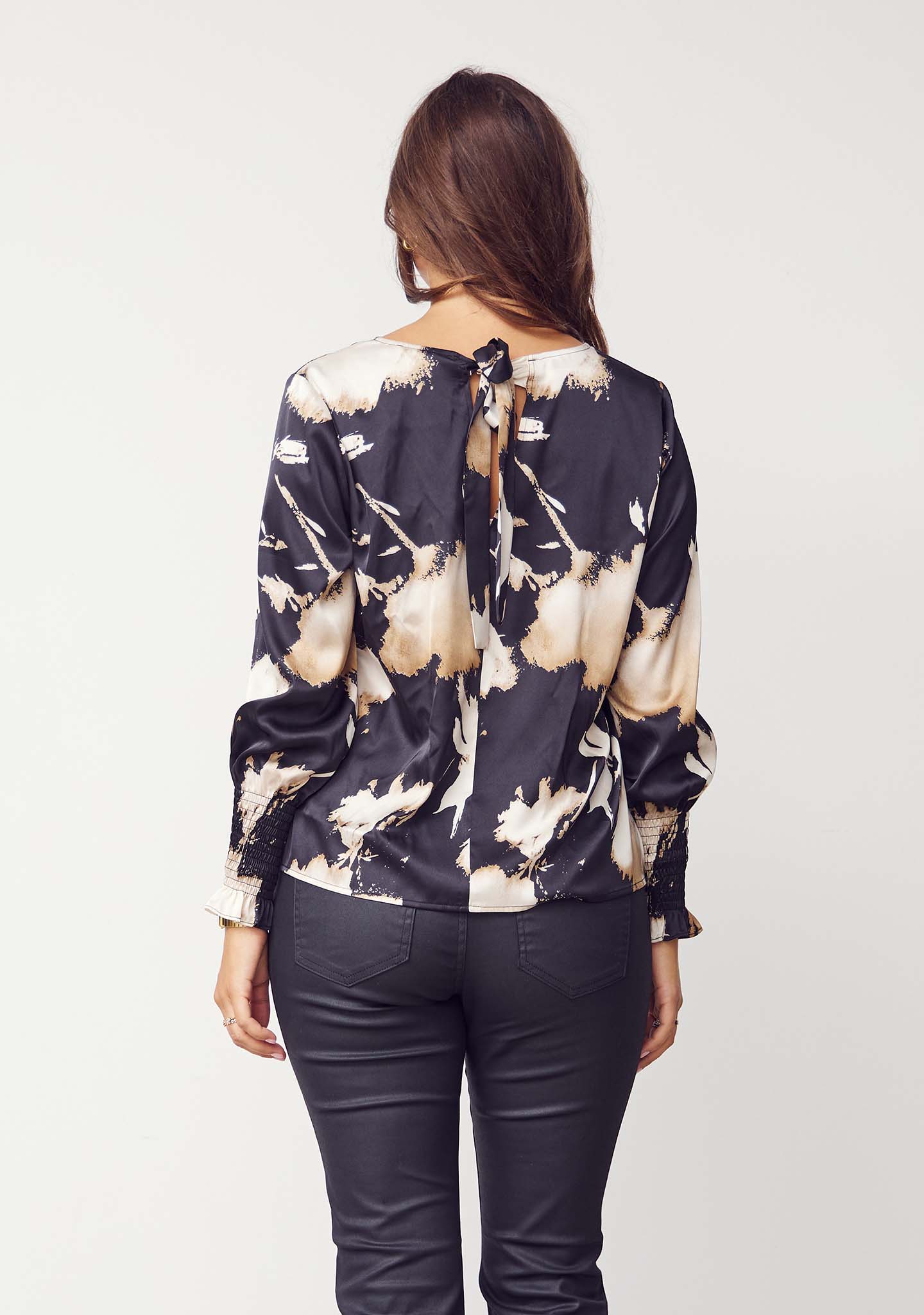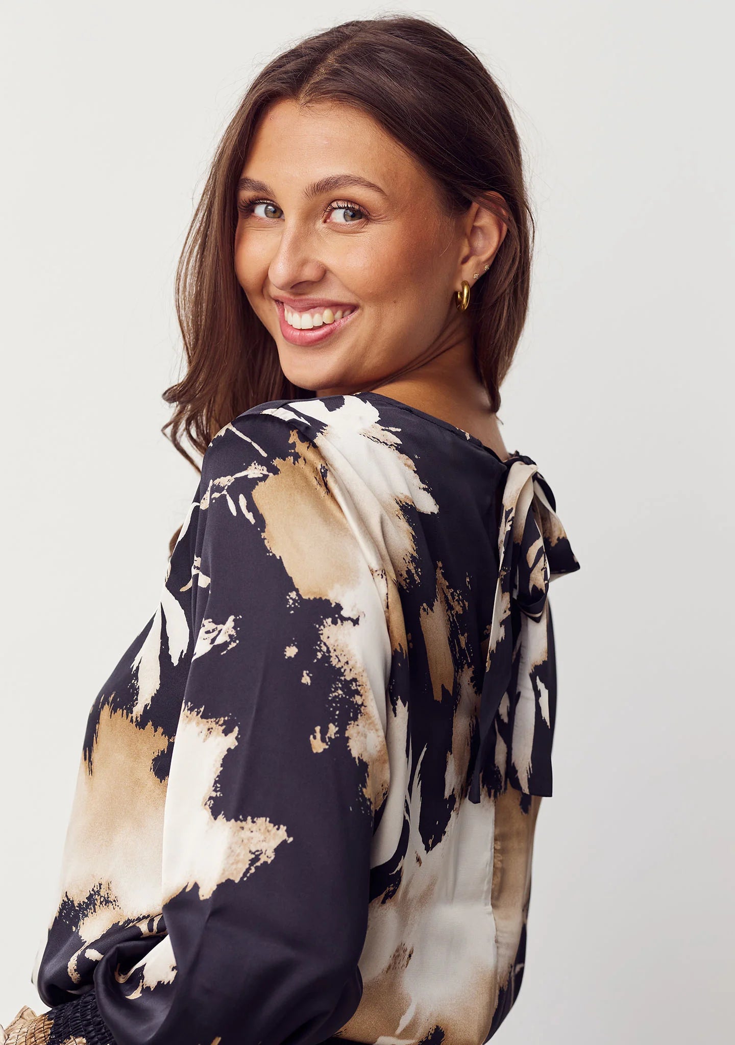 Bagpå har Kleo Blouse et påsyet bånd i nakken, som du kan binde til sløjfe eller lade hænge løst – alt efter dit udtryk. Kvaliteten er vævet polyester med let glans og et smukt fald.