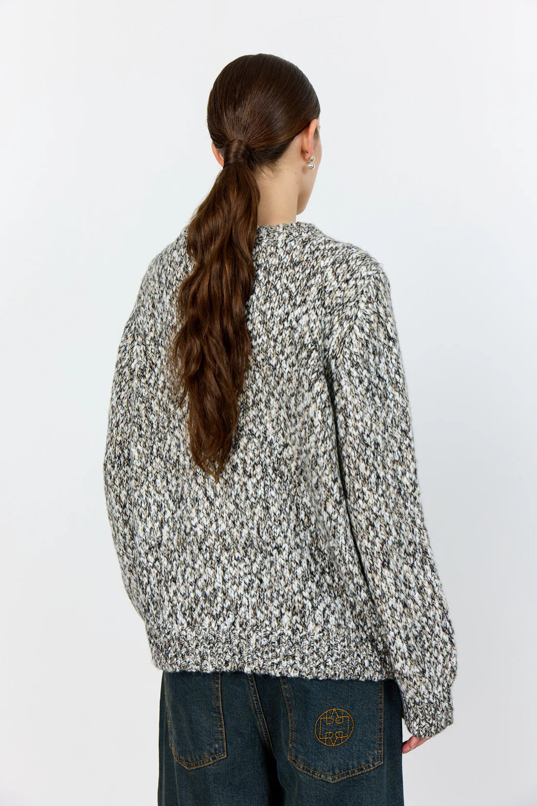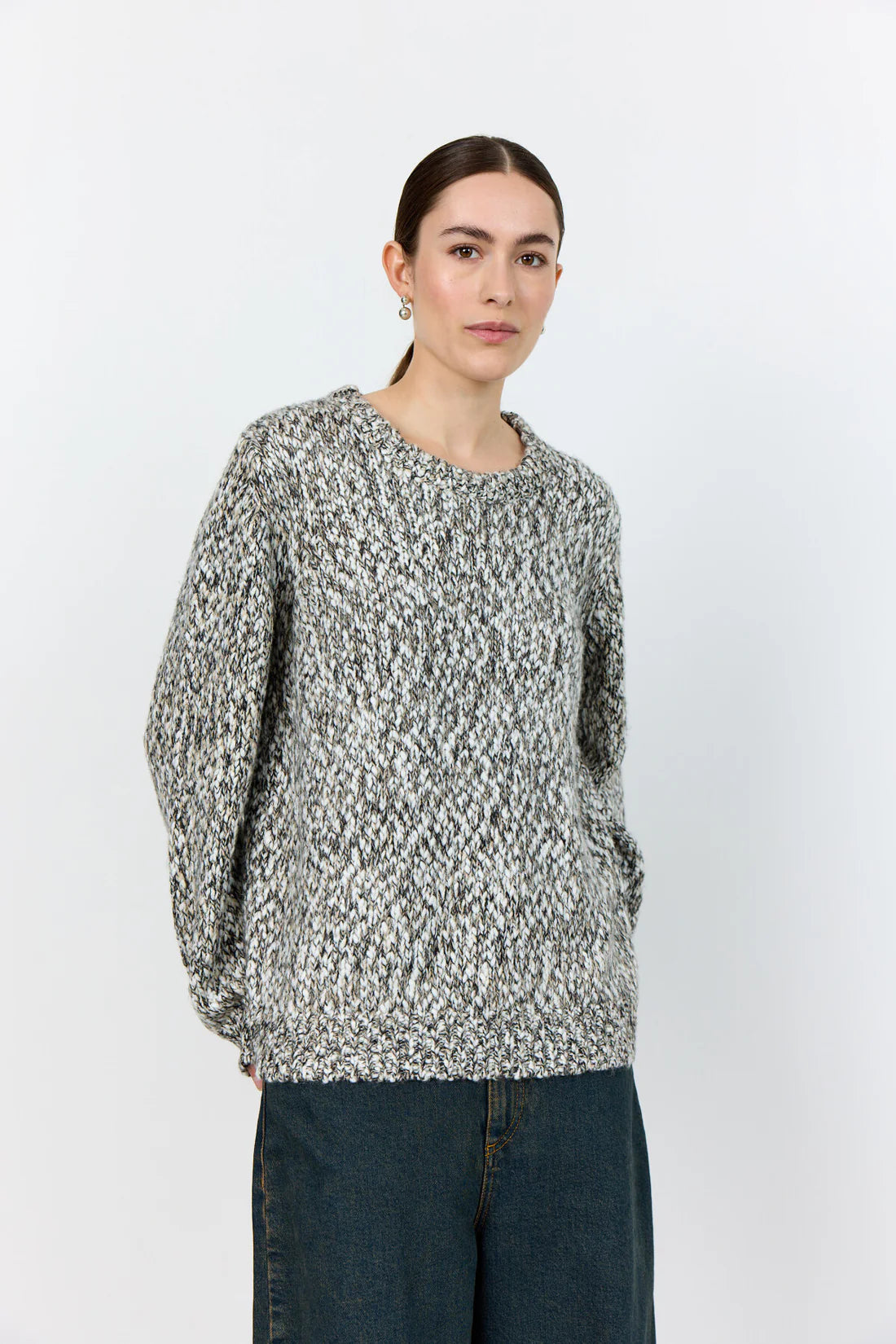 LR-NOELLA 2 er en komfortabel pullover fremstillet af 50 % akryl, 25 % nylon, 20 % uld og 5 % alpakka. Pulloveren har en rund halsudskæring, lange ærmer og et chunky strikmønster. Brug denne dejlige pullover over en oversize skjorte og et par jeans for et ubesværet look.