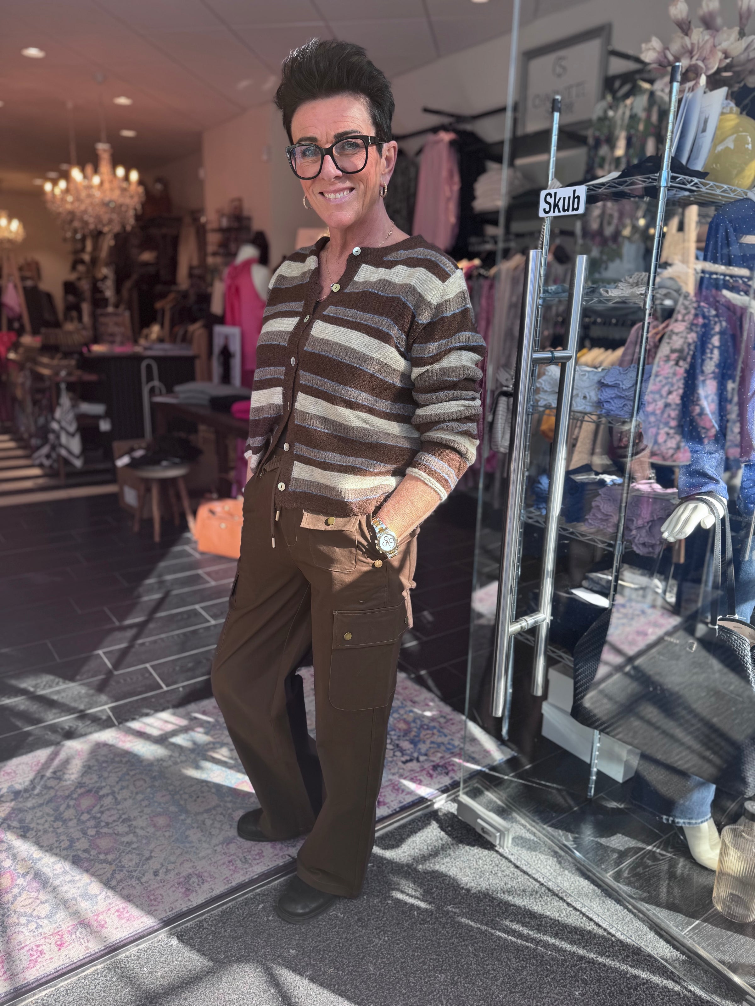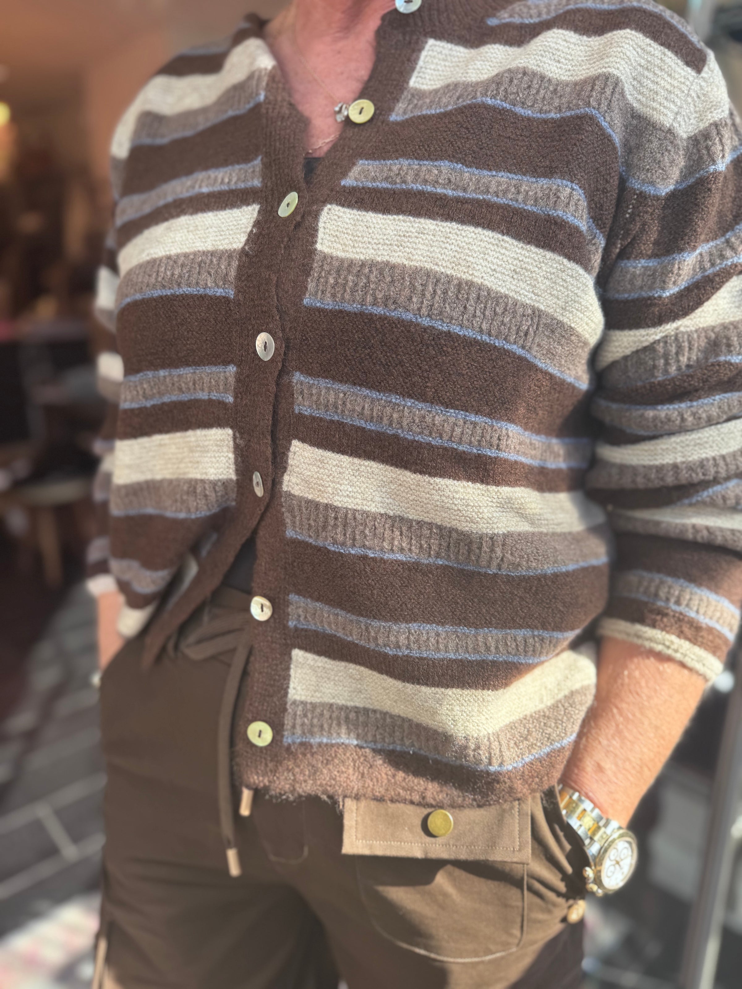 Lækker brun mix stribet cardigan , med et lille kornblomst blå strejf.
