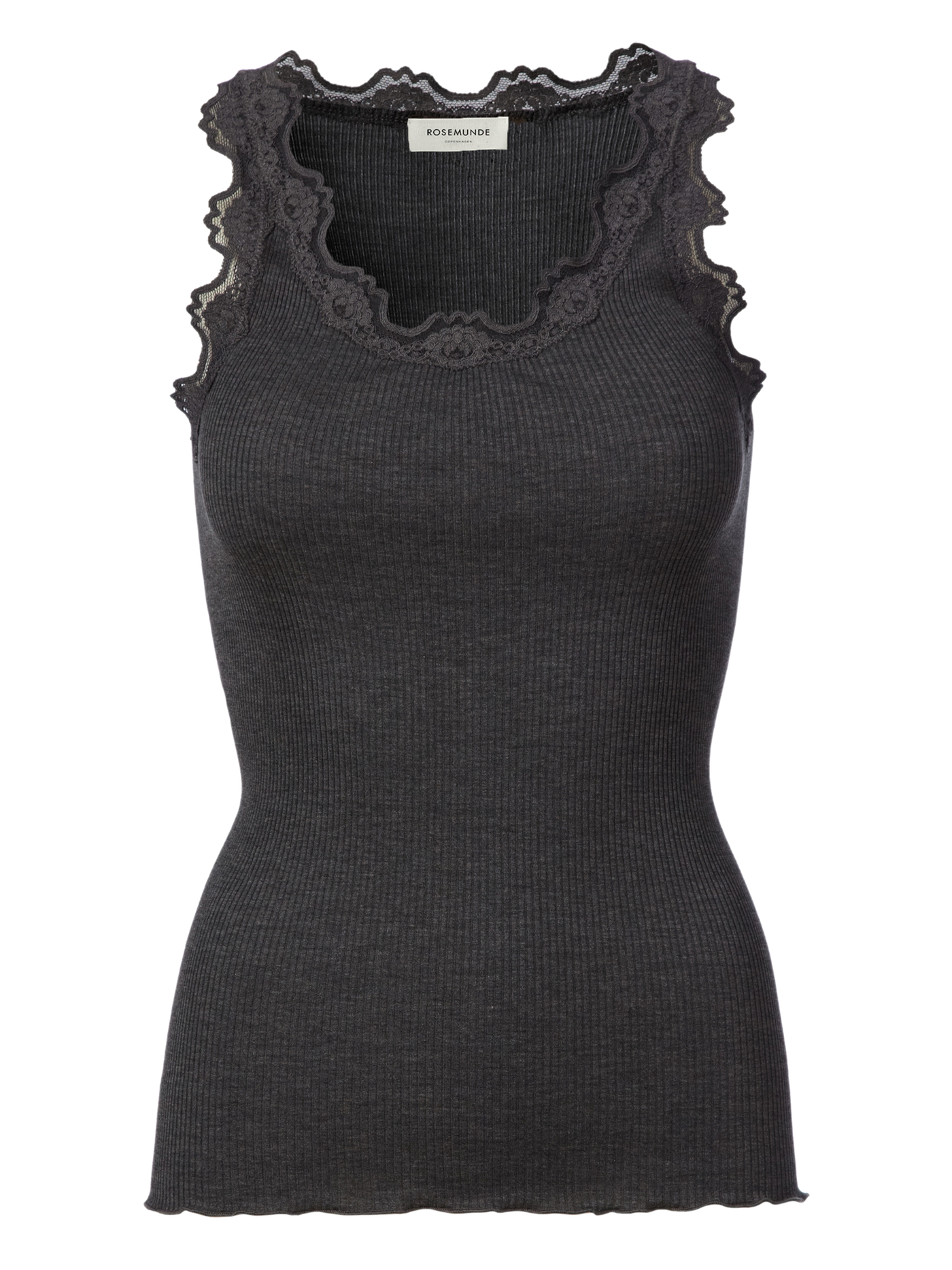 Rosemundes ikoniske silketop er designet med en fin blondekant omkring den runde halsudskæring, og har en fin krølkant forneden, som fuldender det feminine udtryk. Toppen er rundstrikket i en blød ribbet silkekvalitet uden syninger i siden, hvilket gør den utrolig behagelig at have på.