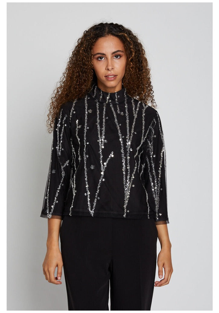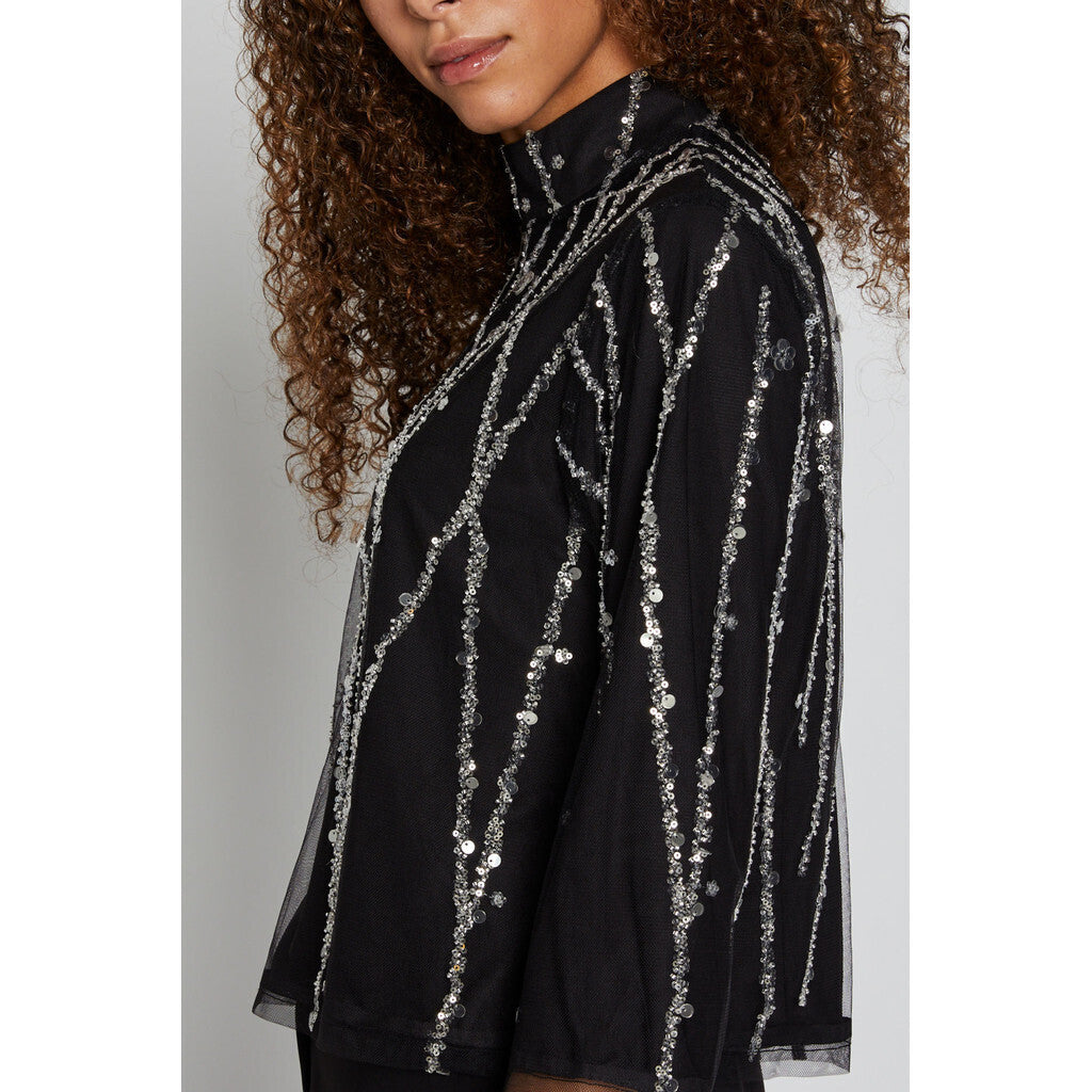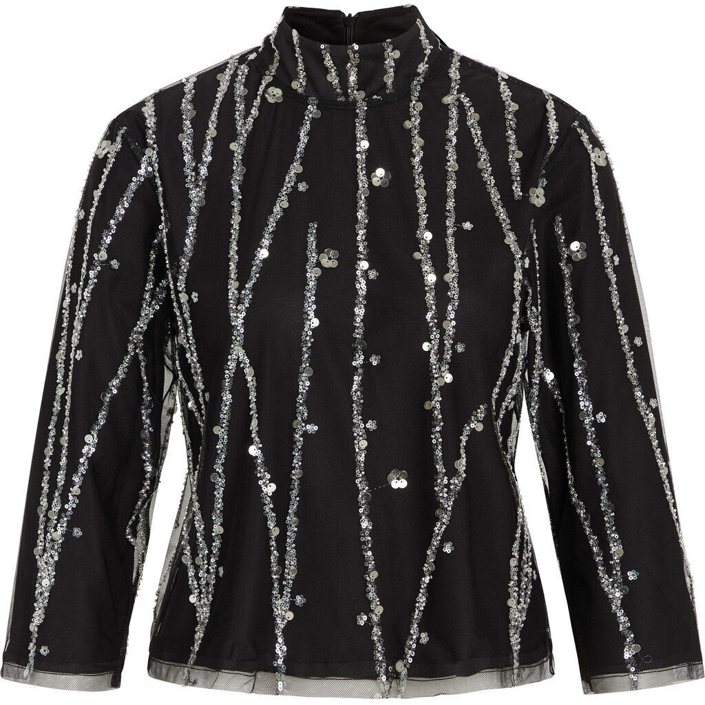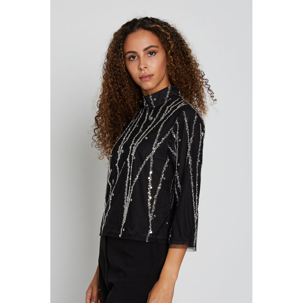 DaffiBBIgnaras blouse er en elegant og glamourøs bluse, designet med sølvpallietter, der tilføjer et strålende touch til enhver garderobe. Blusen har en regulær fit, 3/4 ærmelængde og en kort længde, hvilket giver et moderne og sofistikeret look